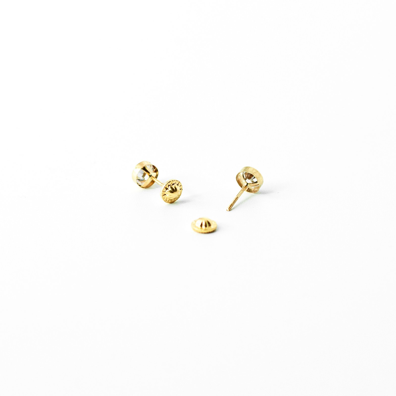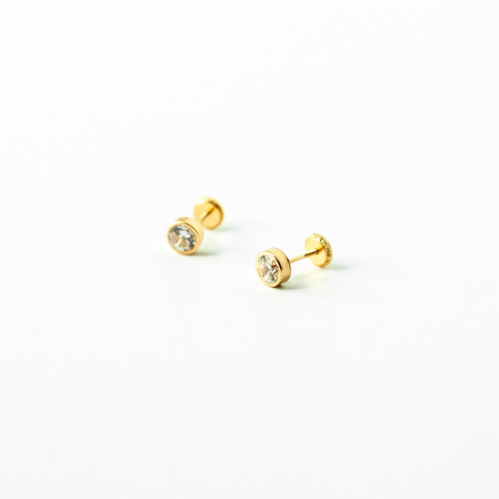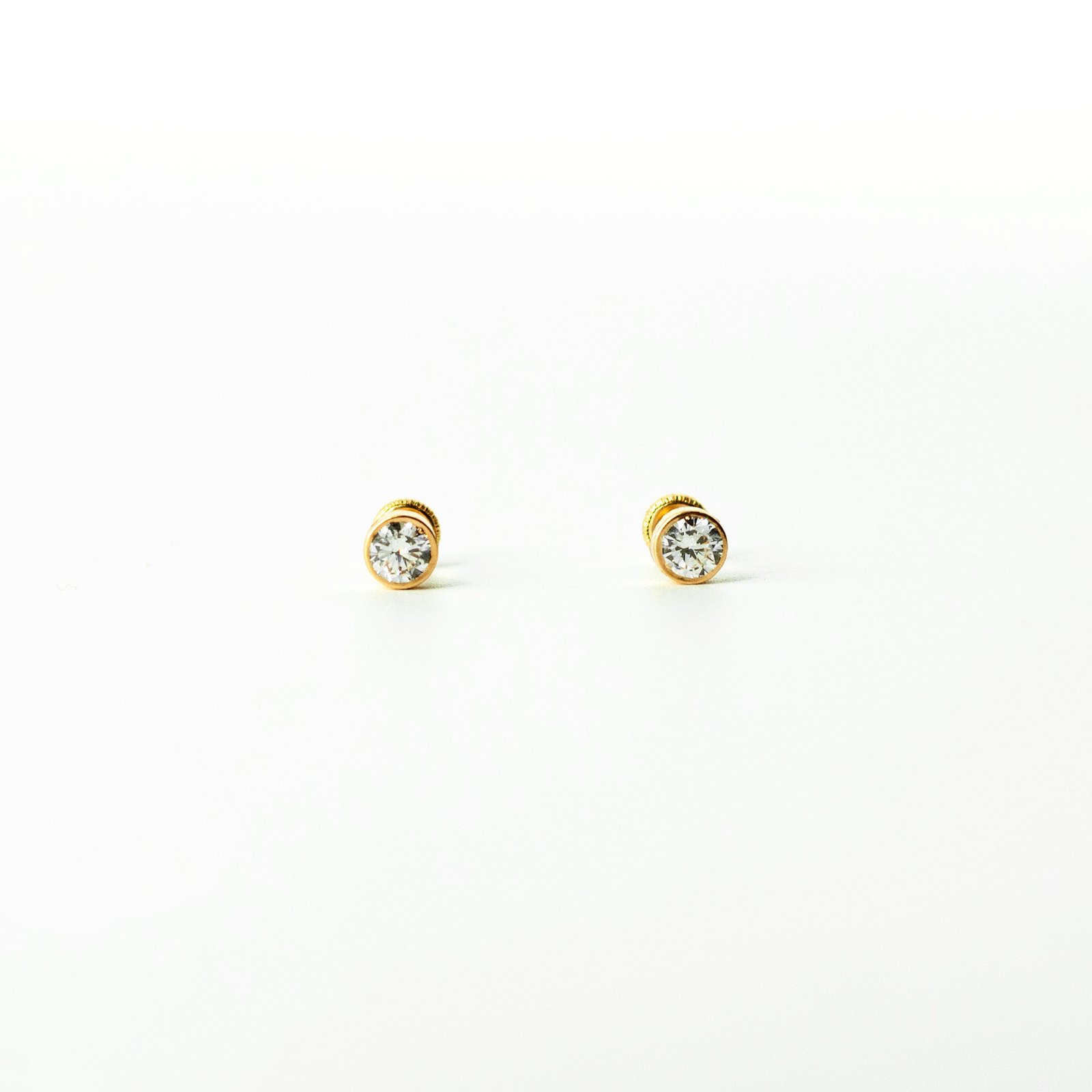 Especificaciones Técnicas: Pendientes redondos de chatón con 1 circonita de 3 mm fabricados en oro de 18 ktes, con cierre de tuerca.